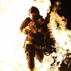 The brave firefighter saved the girl from the burning building.