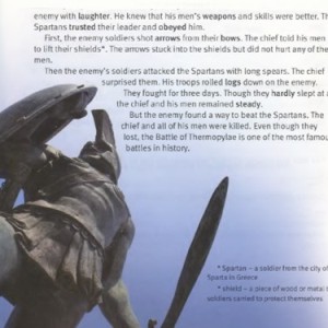 Soon, long lines of the enemy’s army twisted around the hills. The chief met the enemy with laughter. He knew that his men’s weapons and skills were better. The Spartans trusted their leader and obeyed him.
