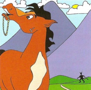 She got on her horse, Lulizar, and rode to the place where the Devil Mother lived. When she got off, Lulizar said, "As soon as you find the necklace, get out! Jump out the window and I will catch you." The girl went quietly inside. She looked around for some time. She found the necklace and jumped out the window onto Lulizar. The Devil Mother saw a boy riding away with her necklace. She pointed her magic finger, and said, "I curse you, boy! From now on, you will be a woman!"